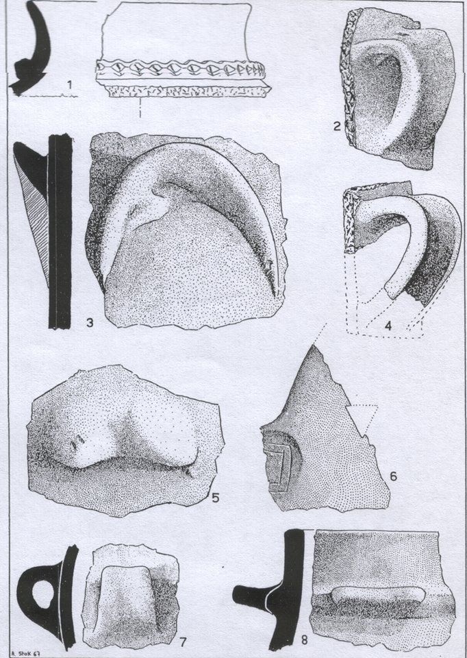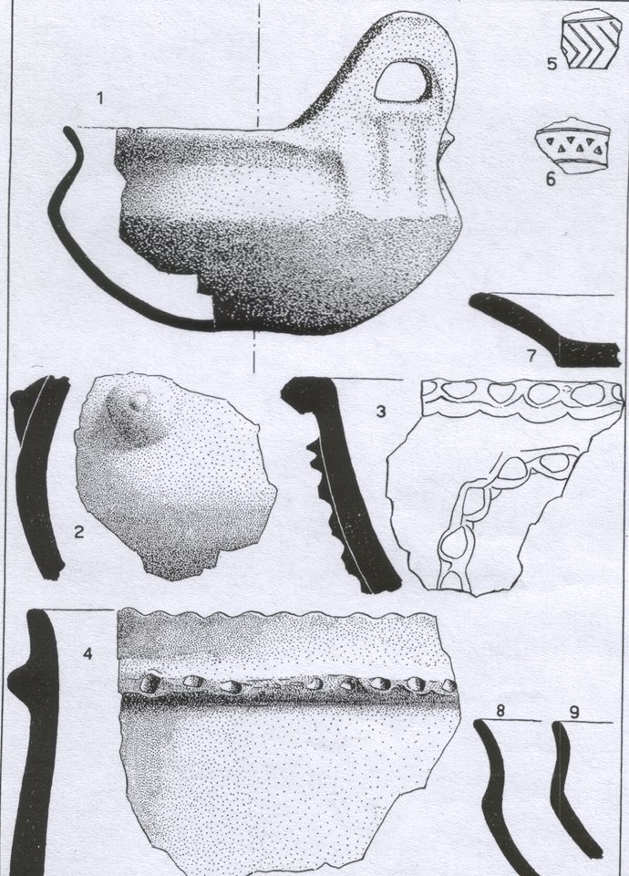 Interessante il livello sottostante a quello romano che ha restituito abbondanti resti di rozza ceramica d’impasto e alcuni frammenti di ceramica con decorazione incisa e ad intaglio, frammenti di ciotole, due anse verticali a nastro, prese rettangolari ed a linguetta. A condizione che il deposito archeologico non abbia subito dei rimaneggiamenti, pare che il materiale fittile del secondo livello, possa essere attribuito ad una fase Finale dell’età del Bronzo, forse ad un periodo inoltrato, già orientato in senso Protovillanoviano, della cultura Subappenninica. Non si può escludere anche, però, che il suddetto complesso preistorico sia dovuto ad un attardamento culturale. Rilevante appare, nel secondo livello stratigrafico, il rinvenimento di un notevole numero di ceramica, d’impasto bruno-rossastro e di impasto bruno-nerastro spesso con superficie ben lucida, dell’età del Bronzo Tardo. Si tratta di ciotole carenate, spesso con anse a piastra, di basse ciotole svasate, di piatti inornati, di grandi contenitori e dolii, spesso con labbro ondulato ad impressioni digitali, e cordoni plastici pure con impressioni digitali.