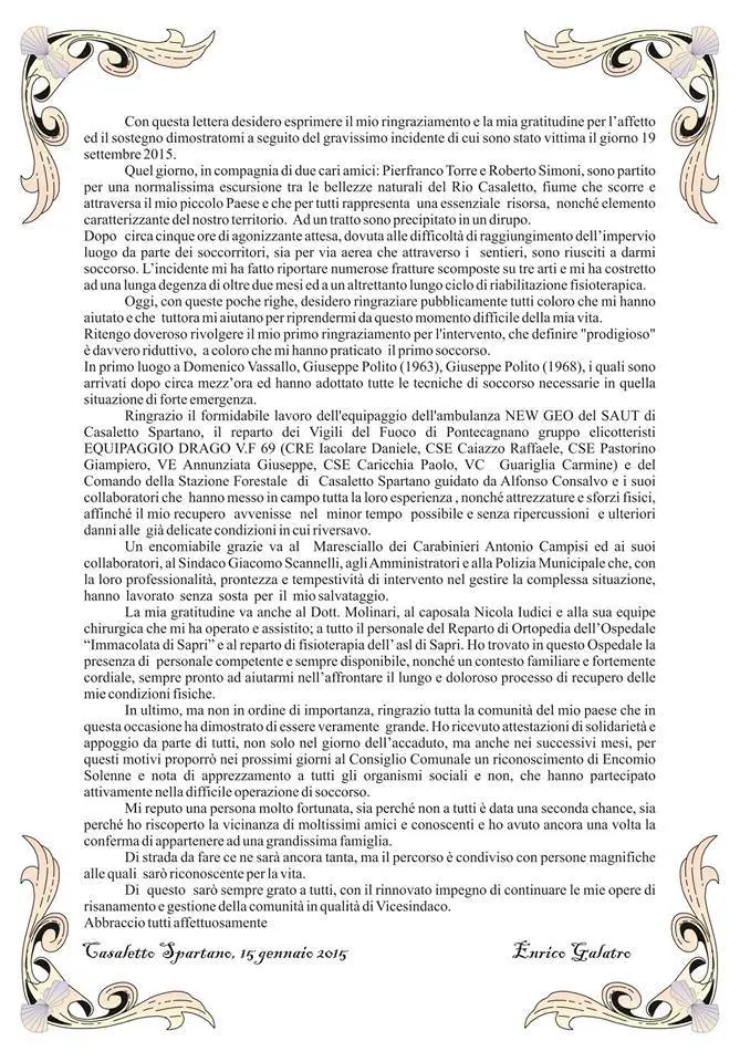 In una lunga lettera aperta i ringraziamenti sono rivolti agli amici, ai sanitari, ai vigili del fuoco, ai carabinieri, al sindaco Giacomo Scannelli e agli altri amministratori, agli uomini della polizia municipale ed ai sanitari dell’ospedale di Sapri.