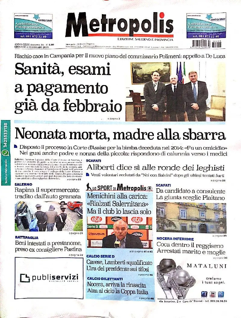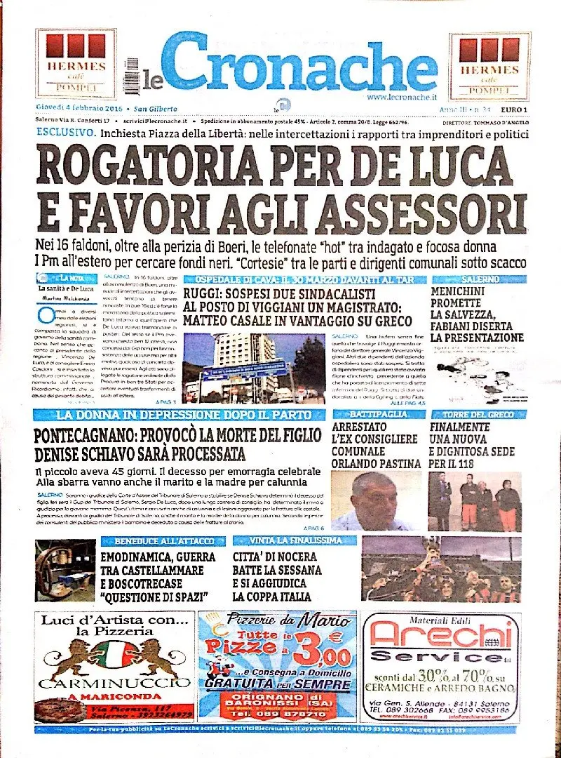 Rassegna stampa del 4 febbraio 2016. Ecco le prime pagine dei quotidiani salernitani oggi in edicola. Clicca in basso per sfogliare La Città, Le Cronache, Metropolis.