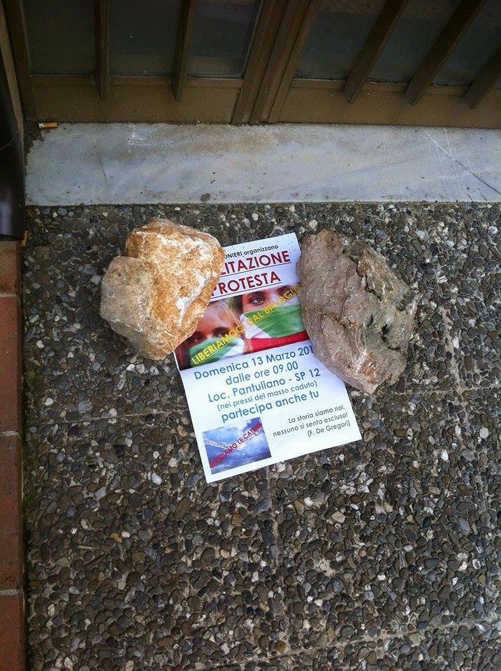Al termine della mobilitazione, in ogni paese, ai piedi dei portoni delle case comunali sono stati lasciati dei massi caduti dal costone roccioso sulla Sp 12.