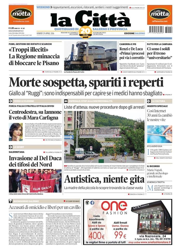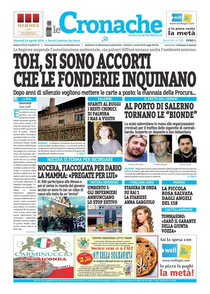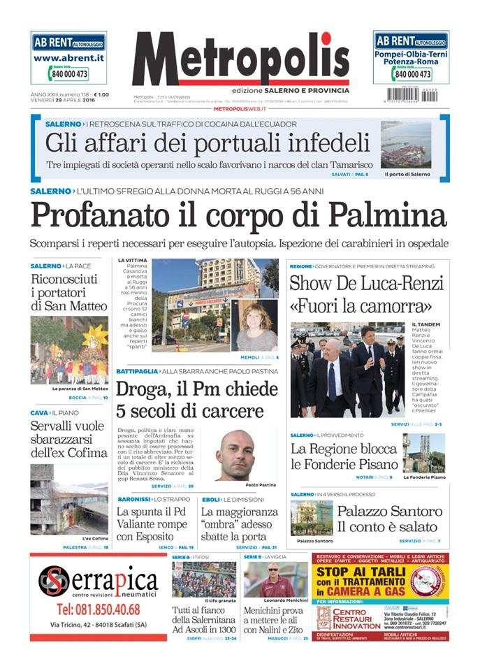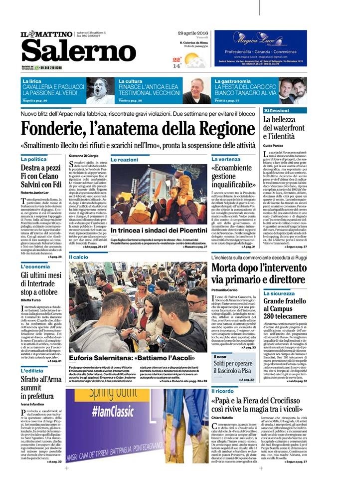 Rassegna stampa del 29 aprile 2016. Ecco le prime pagine dei quotidiani salernitani oggi in edicola. Clicca in basso per sfogliare Il Mattino, La Città, Le Cronache, Metropolis.