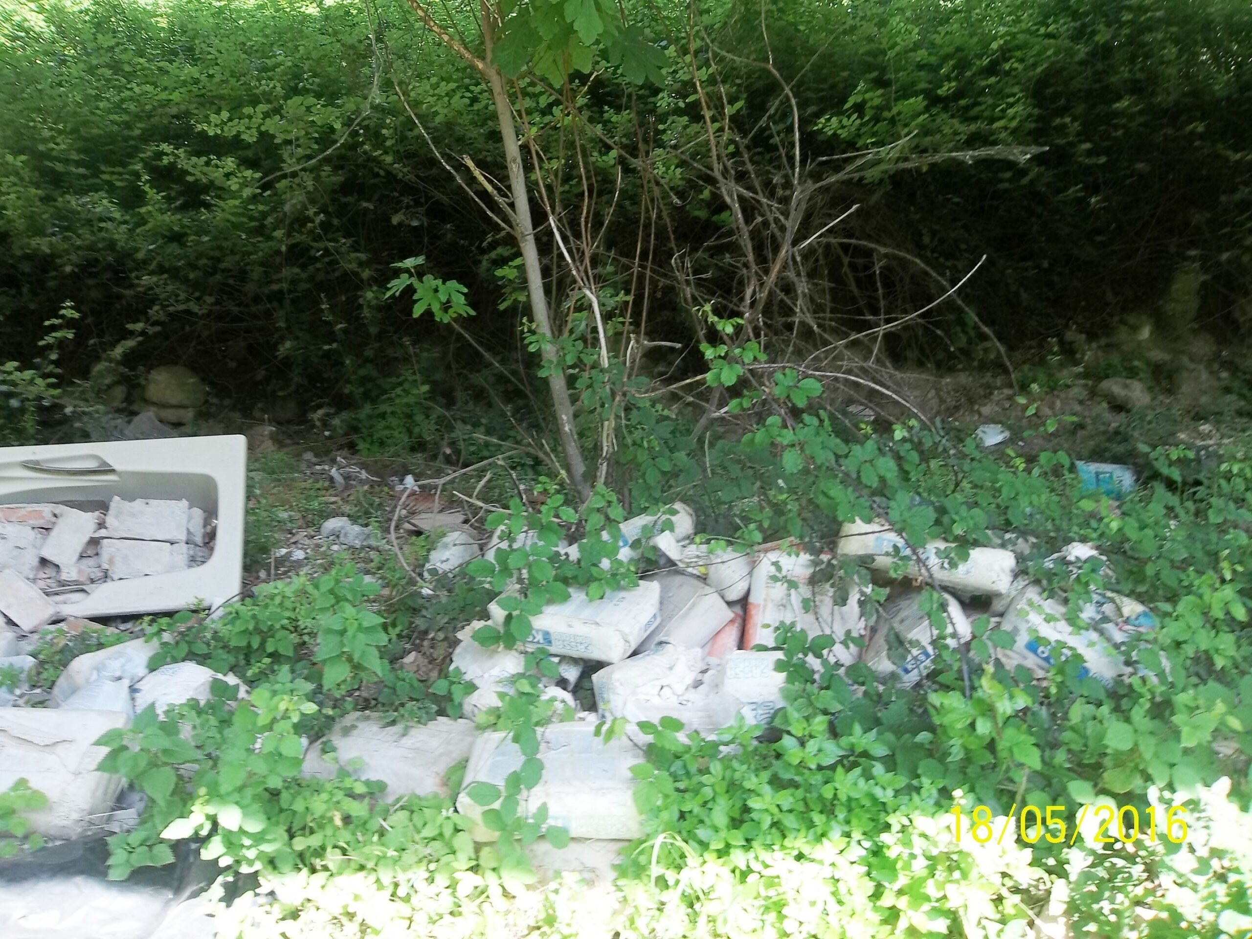 I rifiuti consistono in diverse buste nere contenenti lastre di amianto, guaine catramate, sacchi di calce esausta, vasca di plastica, materiale abbondante di risulta.