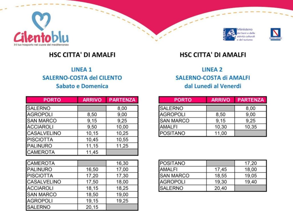 Collegamenti A/R da Salerno per Agropoli, San Marco, Amalfi, Positano (coincidenza per Capri).