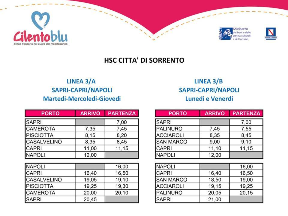 Collegamenti A/R da Sapri per Palinuro, Acciaroli, San Marco, Capri e Napoli.