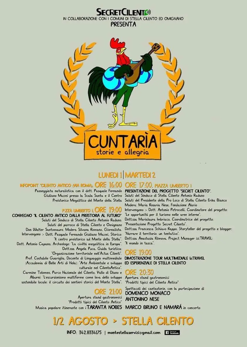 Esiste una memoria impressa nei suoni e nelle parole di una tradizione autentica e genuina che è quella orale fatta di aneddoti, proverbi, stornelli, vecchie storie e leggende di cui il Cilento ne conserva delle tracce ancora vive. A Stella Cilento l’uno ed il due agosto si rivive questa realtà popolare ricca di storia e allegria nelle due serate di Cuntarìa, l’evento promosso da Info Point Cilento Antico è parte di un progetto turistico di più ampio respiro, “Secret Cilento”, che verrà presentato proprio durante le due giornate: questo progetto, elaborato con il supporto tecnico dell’azienda olandese IziTravel e supportato dalle amministrazioni comunali di Stella Cilento e Omignano, intende promuovere e valorizzare in ottica turistico-esperienziale i luoghi, la cultura e le artigianalità nascoste del nostro territorio e ignorate dai circuiti turistici convenzionali. Cuntarìa ne riflette a pieno l’intento poichè “li cunti” cilentani sono espressione verace dei luoghi e ne contraddistinguono l’identità svelandone i segreti e le peculiarità più nascosti che ne definiscono l’unicità. Ricco il programma della manifestazione, tra cultura, musica, artigianato locale ed eccellenze culinarie alle quali sarà dedicato lo spazio della degustazione “Prodotti tipici del Cilento Antico” che vedrà come ospiti la cipolla di Vatolla, l’associazione di Santa Lucia (Sessa Cilento) che proporrà gli strangolaprievati con carne di cinghiale, la Pro loco di Omignano paese che cucinerà il soffritto ed inoltre altri stand di Stella Cilento che si dedicheranno ai piatti tipici del Cilento antico. Tutto all’insegna dello scambio e rete di informazione sul Cilento e i suoi segreti per raccontare a tutti chi sono stati, chi erano e chi sono i cilentani di ogni dove attraverso tutte le sue espressioni. Il Programma culturale delle due giornate vede protagonisti studiosi ed istituzioni del Cilento antico, esperti e studiosi del territorio: il primo agosto a partire dalle 16.00 vi sarà la Passeggiata naturalistica con il Dott. Pasquale Fernando Giuliano Mazzei presso la Scala Santa e il Centro Preistorico Megalitico del Monte della Stella, alle 19.00, Piazza Umberto I il Convegno: “Il Cilento Antico dalla preistoria al futuro” , apertura stand gastronomici “Prodotti tipici del Cilento Antico” e musica popolare itinerante con i “Taranta Nobes”; il due agosto ore 17.00, Piazza Umberto I, Presentazione Progetto “Secret Cilento”, prosegue la serata all’insegna del gusto e delle attività di Cuntarìa, una rievocazione del passato ma anche una viva espressione della natura dei luoghi ancora presente dove “i cunti” restano la traccia più trasparente dell’anima di questo territorio tra suoni strofe e stornelli di “tanno e mò”, tra passato e presente, con gli spettacoli dei Cantastorie Antonio Nese e Domenico Monaco ed il concerto di Marco Bruno e Namara.