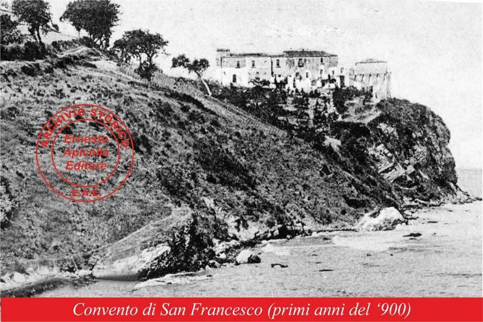 “Signorino, se volete visitarlo vi tocca scendere a mare, io non ci vengo. Non ho le gambe vostre, io. Ma voi andateci. La grandezza di San Francesco è là!!!” E nel dire, accenna col dito a un punto di mare. “ Quello è lo scoglio.”… dette un sospiro e cominciò, come una predica il racconto del Serafico Frate: “ Eccellenza, San Francesco è stato da queste parti e questo Monastero lo fondò lui. Ma la gente di Agropoli non lo vollero ascoltare…gente senza fede!!! E allora il Povero Santo si rivolse alle creature del mare. Là sotto c’è uno scoglio in mezzo all’acqua e San Francesco andò un giorno a mettersi là. Le acque, quiete quiete, fecero movimenti come un freddo alle carni, e poi uscì un mormorio come di tante voci e poi… dove mai tanta specie di pesci? Sopr’acqua, l’avevano parata tutta quanta, pesci grossi, e pesci piccoli, triglie e merluzzi, calamai e seppie, sauri, cefali e cefalotti, tonni, palumbi e cernie e …chi può dirveli tutti? Con la boccuccia aperta, con gli occhietti vivi, con le pinne rialzate quasi volavano al Santo, l’attorniavano con amore e Lui che s’affannava, faticava a predicare a loro l’unione e l’amore e la magnificenza di Dio. Ah, che smacco per la gente di Agropoli senza fede! E San Francesco allora disse che il pulpito suo, lo scoglio, non dovevano passarlo mai le acque. E quando infuria e fa tempesta, e i cavalloni minacciano fino la rupe di Agropoli, la pietra sempre fuori! E gli antichi ci misero sopra, come segno del miracolo, una croce. Con tutto questo che sta succedendo, non si crede più. Prima, ogni marinaio era di San Francesco, viveva per San Francesco, e ora?… Vanno, vengono, svoltano lo scoglio, e non gli danno più nulla: non una preghiera, non uno sguardo, nemmeno una coda di pesce, più. San Francesco mio!!!”