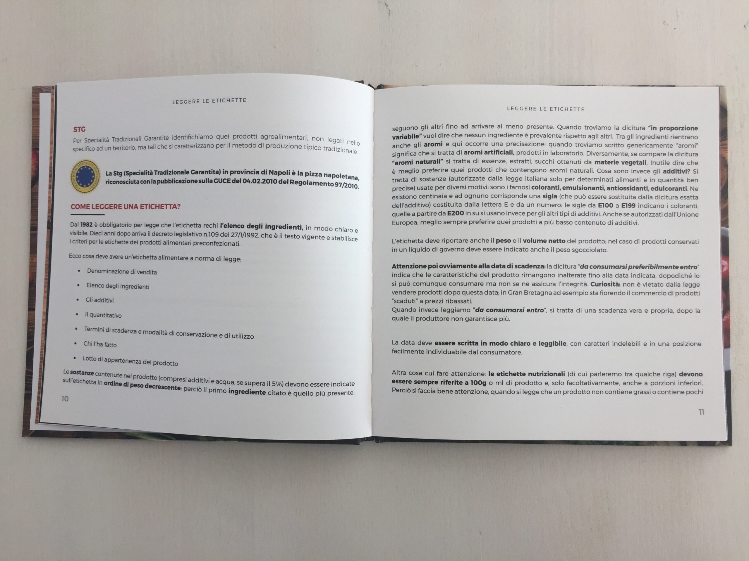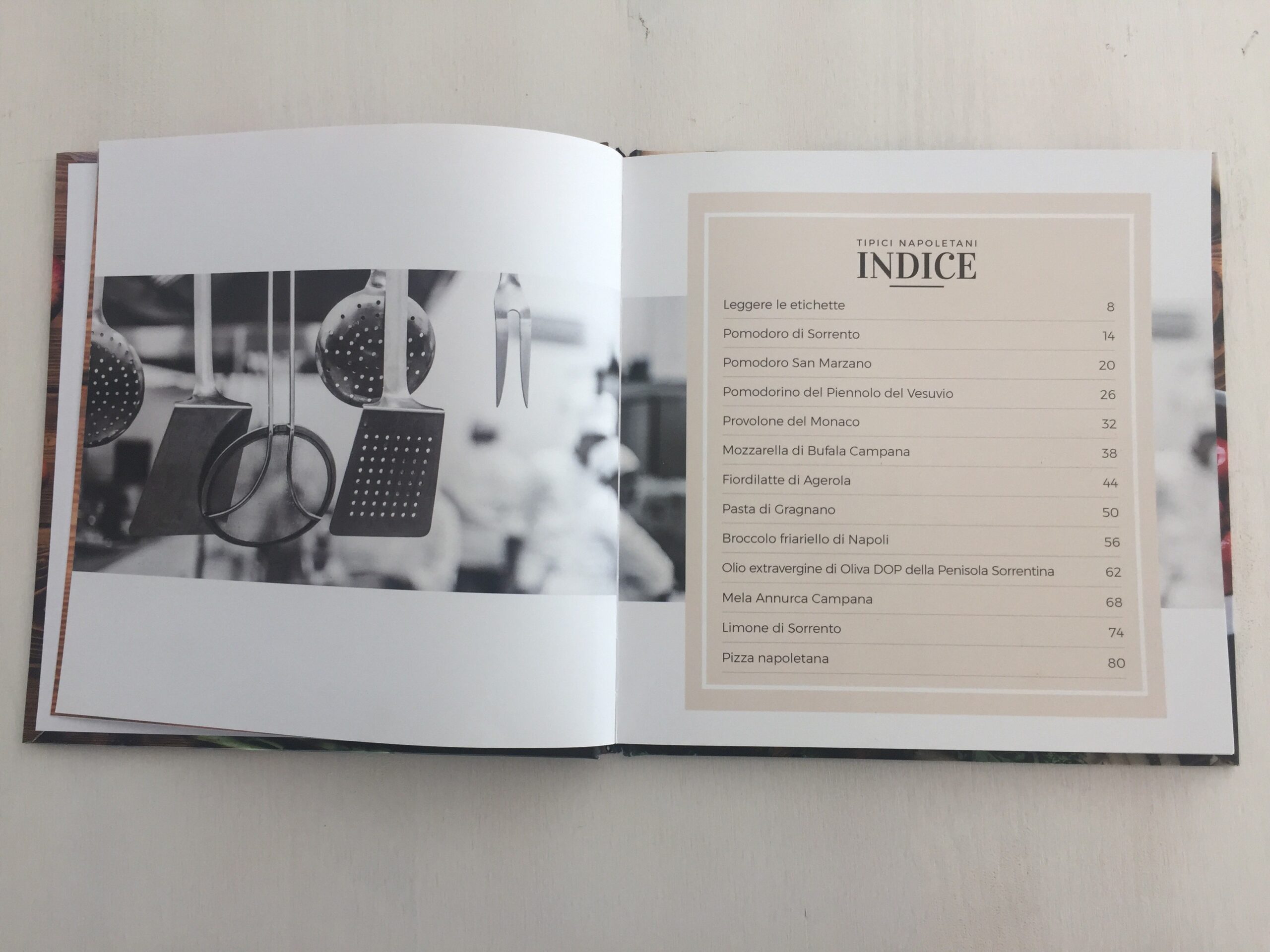 Luciano Pignataro ha precisato «Il nostro passato in realtà è il futuro perché il futuro è fatto dal gusto e dalla salute. I veri gourmet in Italia, oggi, puntano sui prodotti buoni che fanno veramente bene e la ricchezza del patromonio napoletano è qualcosa di enorme». Nell’opuscolo infatti si accende il faro sul Pomodoro di Sorrento, quello San Marzano, il Pomodorino del Piennolo, il Provolone del Monaco, la Mozzarella di Bufala Campana, il Fiordilatte di Agerola, la Pasta di Gragnano, il broccolo friariello, Olio extravergine di Oliva, la Mela Annurca Campana, il Limone di Sorrento e la Pizza Napoletana. Nel libro viene spiegato cosa sono i marchi DOP, IGP e STG dell’Unione Europea per i prodotti alimentari che ne disciplinano la produzione e li proteggono dalle contraffazioni. Spiega nel dettaglio come leggere e a cosa serve l’ Etichetta dei prodotti alimentari preconfezionati che dal 1982 è obbligatorio apporre l’elenco degli ingredienti, in modo chiaro e visibile. Adesso arriva il bello: per ogni prodotto suddetto è stata inserita una scheda nutrizionale e la sua storia. Non è tutto: sempre per ogni ingrediente sono state dedicate due ricette ad omaggio del prodotto una tradizionale a cura dall’Istituto Duca di Buonvicino Bruna Musello con la partecipazione della Preside, dei docenti e degli alunni ed una innovativa selezionata dalle tantissime ricette registrate sulla piattaforma web MySocialRecipe che si opera sulle certificazioni delle ricette da parte di tutti quelli che inventano un piatto e vogliono creare un copyright su di essa dicendo “Questa ricetta è mia”.