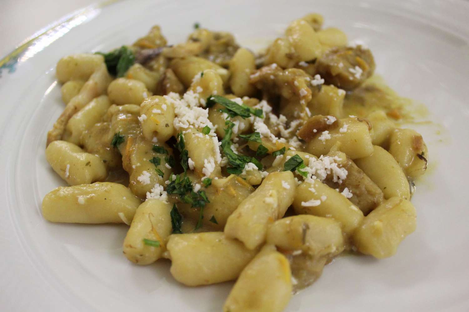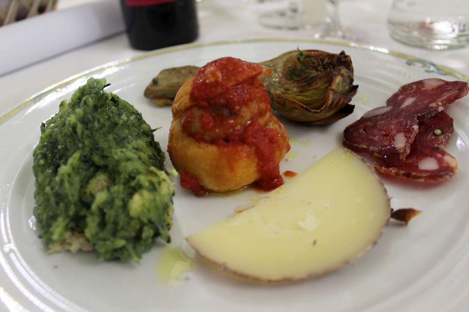 A seguire un antipasto molto particolare: c’era il mallone o come viene chiamato in Cilento “foglie e patate” fatto con le foglie delle cime di rapa. Quello che mi ha colpito è stato il fatto che questa bontà è stata fatta con aggiunta di pane duro fritto che ha conferito al piatto un gusto squisito! Sempre nell’antipasto troviamo un carciofo fritto nello strutto, volgarmente chiamato nzogna, cuzzitiello con polpetta, Caciocavallo ubriaco e salsiccia stagionata sottolio.