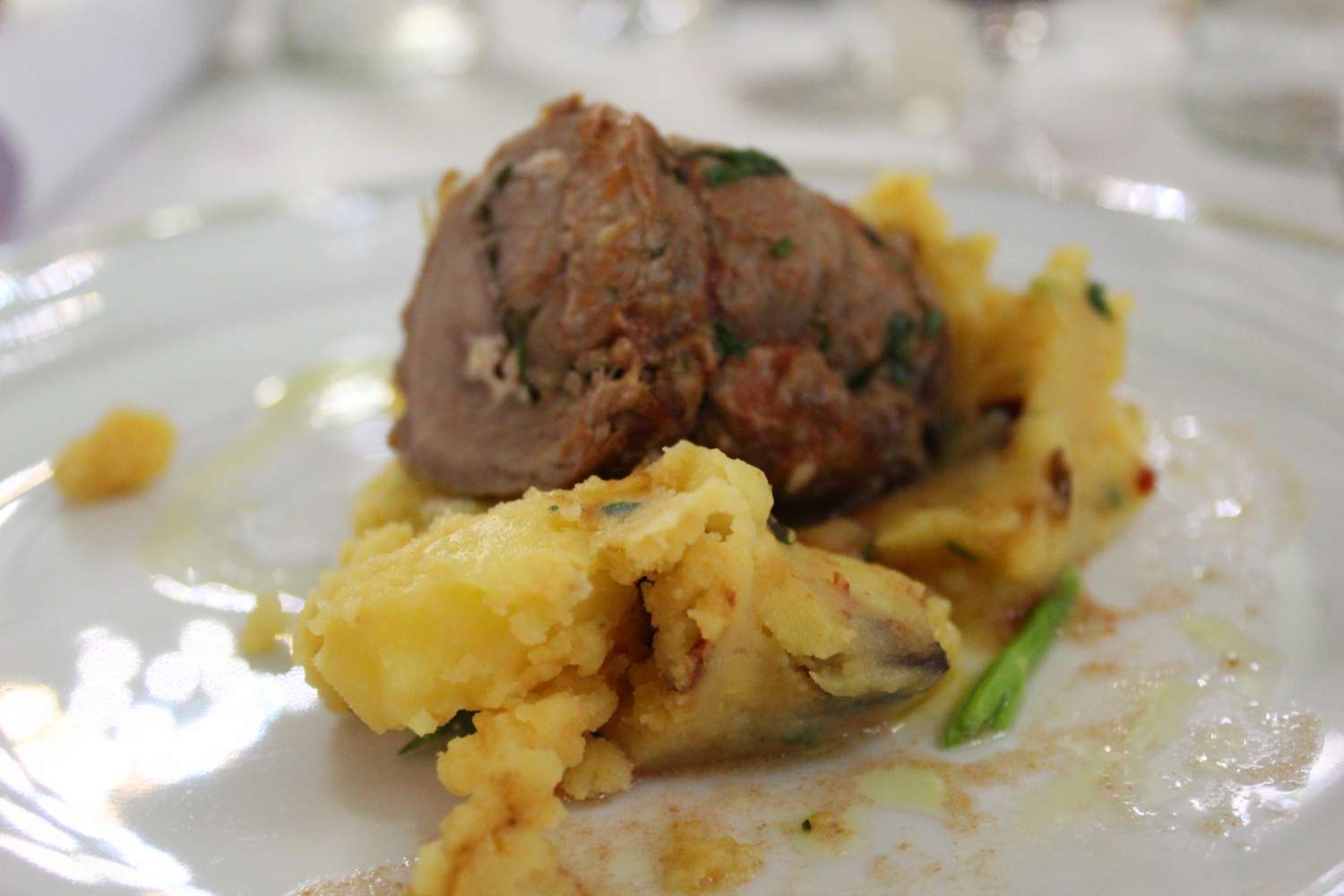 Per pulire un po’ la bocca in attesa del secondo piatto ci è stato portato un sorbetto che in realtà era un gelato al finochietto e pancetta croccante, superlativo. Il secondo piatto classico, tipico della tradizione cilentana, braciola ripiena al cacioricotta e patate con peperone crusco.
