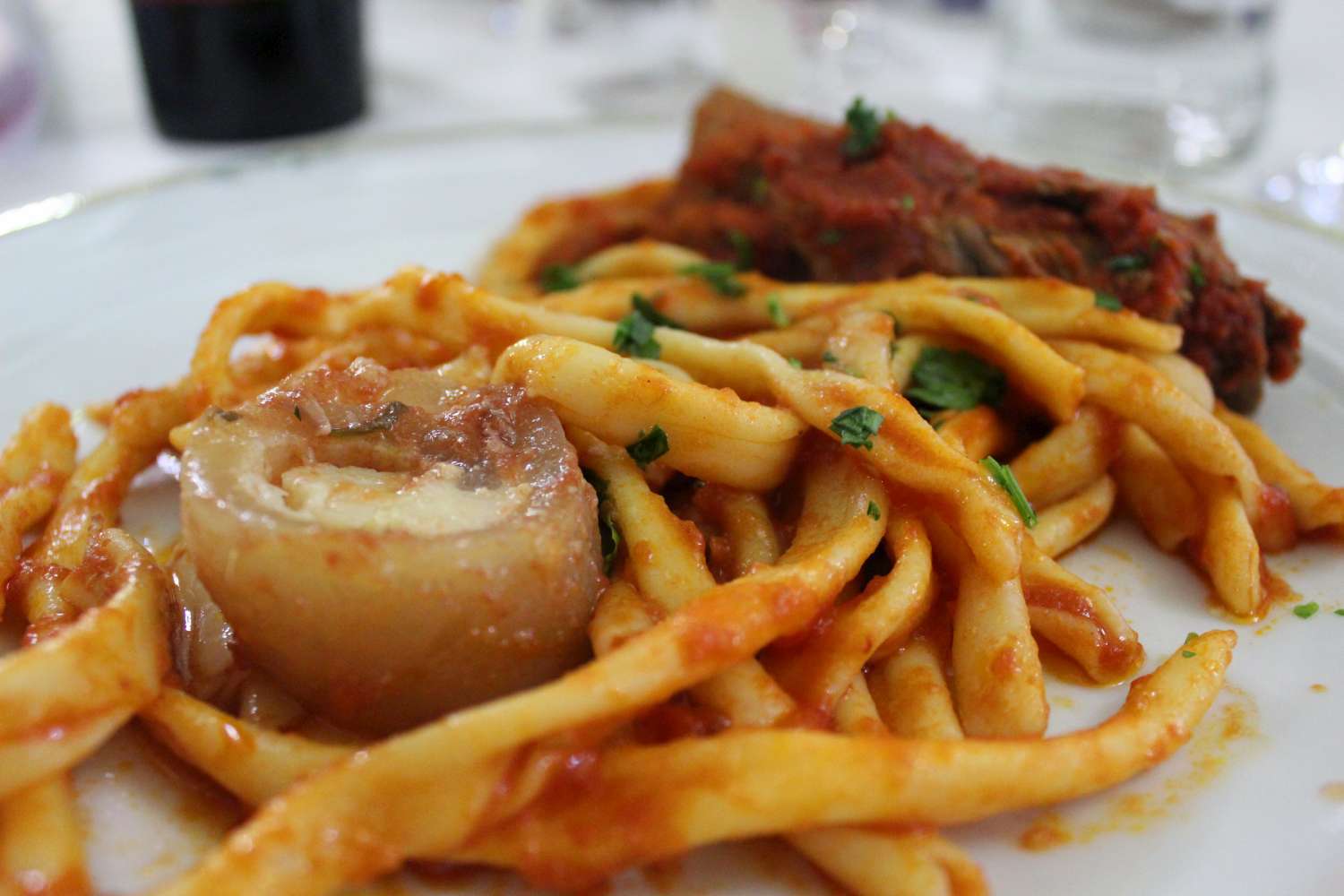 A seguire due primi piatti con pasta lavorata a mano e stiamo parlando di fusilli con il ragù della Valle dell’Orco, fatto con carne e cotica, e cavatielli con funghi porcini, pancetta croccante e ricotta salata.