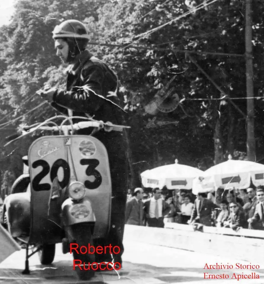 La passione per le corse la praticava con la sua Vespa, scorrazzando a tutta velocità sulle strade sterrate di Agropoli. Negli anni ’50 intraprese la carriera di pilota partecipando con una Vespa, che aveva adeguatamente elaborato per le competizioni, a numerose gare in Italia, tra le quali: il “Giro dei Tre Mari” con partenza da Napoli; la “Mille Miglia Vespistica” con partenza da Brescia (nella foto); il Circuito di Siracusa; ecc.. In tutte le gare Roberto si distinse per audacia e bravura. Nel Febbraio del 1956 fu ospite della Piaggio a Caracas, in Venezuela, per la Fiera Internazionale “Italia Produce”. In quegli anni partecipò a molteplici gare internazionali e, dal 1956 al 1958, fece la spola più volte in nave, dall’Italia al Venezuela, per correre in gare vespistiche. In Venezuela divenne un pilota molto conosciuto e, con i soldi guadagnati, aprì un Vespa Store, con vendita ed assistenza. Gli affari andavano a gonfie vele, ma era forte in lui la nostalgia della famiglia e di Agropoli, per cui decise di vendere tutto e di ritornare definitivamente in Italia. La sua passione per Agropoli era enorme, diceva: “ Ho visto tutto il Mondo, ma Agropoli è bellissima”.