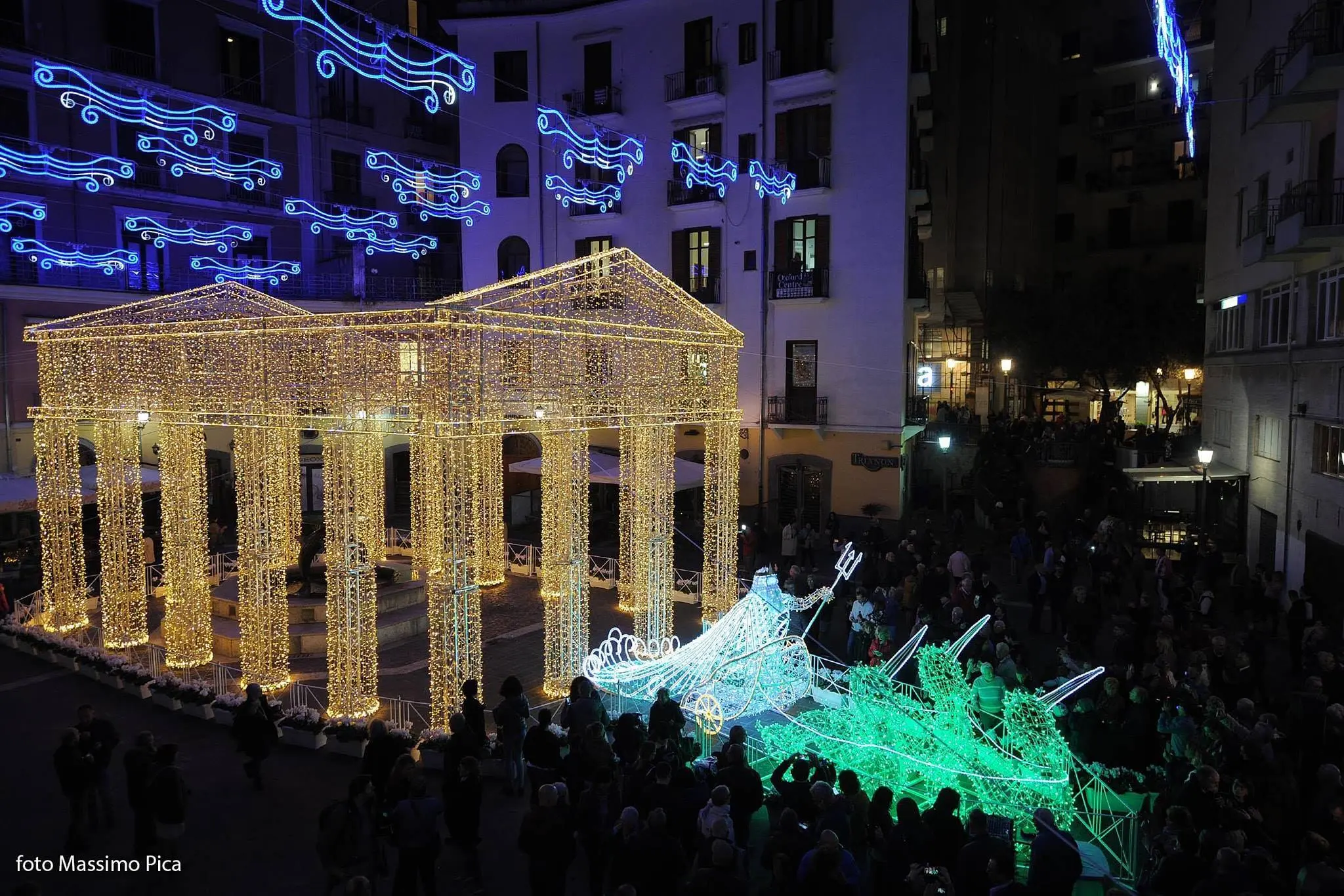 Il tema scelto per l’edizione 2018/2019 delle luci richiama le bellezze della Provincia: la costiera, i templi di Paestum, il mare. Così la villa comunale si è trasformata nell’occasione in un acquario gigante, mentre in piazza Flavio Gioia svetta il tempio con il carro di Nettuno.