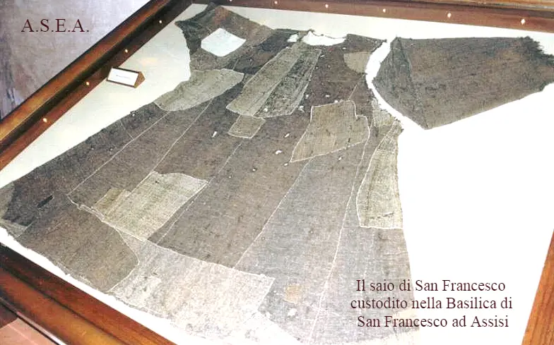 - Il Saio cinerino, tra il bruno e il bigio, molto rovinato e con tantissimi rammendi, che ricorda la dura scelta fatta dal Santo di povertà materiale e sociale. E’ conservato nella sala delle Reliquie della Basilica di San Francesco d’Assisi.