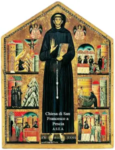 2) “San Francesco e storie della sua vita” è un dipinto, a tempera ed oro su tavola (160x123cm), di Bonaventura Berlinghieri, datato 1235 e custodito nella Chiesa di San Francesco a Pescia. La tavola venne riscoperta, nel 1880 circa, da Michele Ridolfi. In quell’occasione fu ritrovata la data e la firma dell’artista, che confermarono come l’opera, dipinta appena nove anni dopo la morte del Santo, fosse tra le più antiche rappresentazioni. La splendida tavola a fondo oro, dalla tipica forma cuspidata, rappresenta San Francesco d’Assisi posto in piedi in posizione centrale. Il Santo indossa un saio legato tramite un cingolo con tre nodi, che simboleggiano la povertà, la castità e l’obbedienza, ed è incappucciato. Nella mano sinistra regge probabilmente il Vangelo o il libro della Regola, mentre con la destra benedice, mostrando le stimmate. Ai lati del Santo sono rappresentate alcune storie della sua vita: “Miracolo degli storpi; Miracolo degli zoppi; Miracolo degli ossessi; Guarigione di una bimba; Predica agli uccelli; Stimmate.