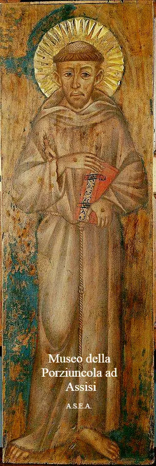 3) L’affresco di Cimabue (Cenni di Pepo: 1240-1302) è un dipinto, a tempera su tavola (107×57 cm), databile 1290 circa ed è conservato nel Museo della Porziuncola presso la Basilica di S. Maria degli Angeli ad Assisi. La tradizione vuole che la tavola sia stata utilizzata come coperchio per la tomba di San Francesco d’Assisi e che vi fosse dipinto il ritratto del Santo. Egli è ritratto a figura intera e con il saio, con l’Aureola e la chierica, barba corta ed il mento appuntito. Impugna con le due mani il libro della Regola e mostra le ferite delle stimmate su mani, piedi e, attraverso uno squarcio nel saio, sul costato.