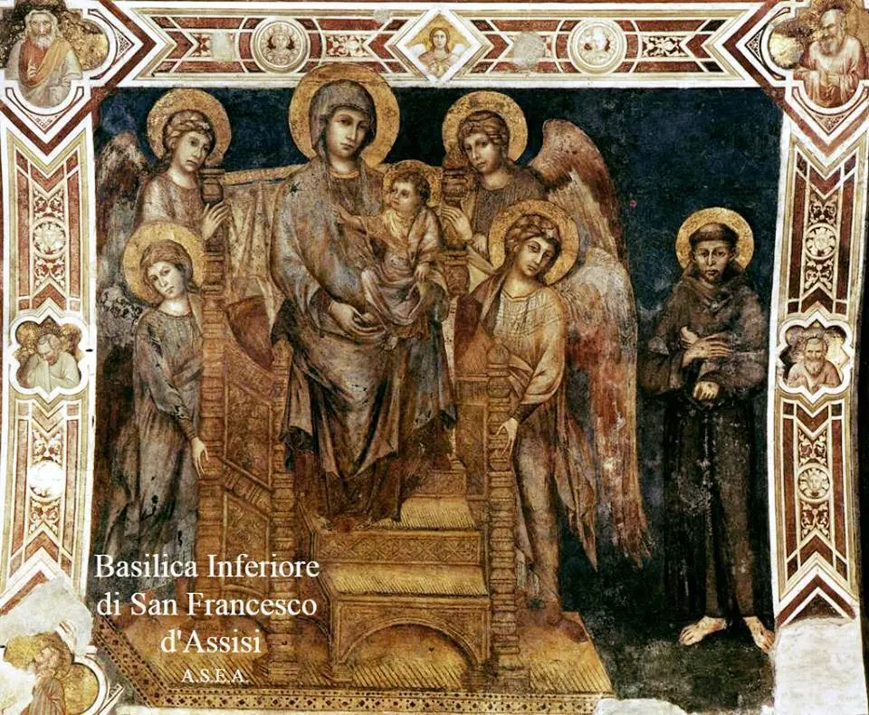 4) Esiste un altro affresco con l’immagine di San Francesco d’Assisi ed è la “Maestà di Assisi”, attribuito a Cimabue, databile 1285-1288. Lo si può ammirare nella Basilica Inferiore di San Francesco d’Assisi. Mostra la Madonna col Bambino in Maestà, cioè su un trono, tra quattro angeli e con San Francesco d’Assisi sulla destra. Il Santo è simile a quello ritratto sulla tavola conservata nel Museo di Santa Maria degli Angeli, purtroppo le ridipinture successive impediscono una chiara lettura sulla reale fisionomia del volto di San Francesco.