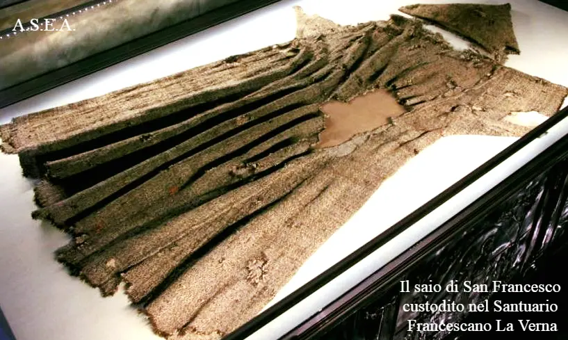 - il Saio indossato il 14 ed il 15 settembre 1224, quando sul monte La Verna chiese, nelle sue notti di preghiera e di solitudine, di provare un po’ dell’amore e del dolore che Gesù Cristo sentì sulla Croce. Fu esaudito ed il suo corpo fu segnato dalle stesse piaghe del Crocifisso. Il Saio è esposto nel Santuario Francescano “La Verna” a Chiusi della Verna.