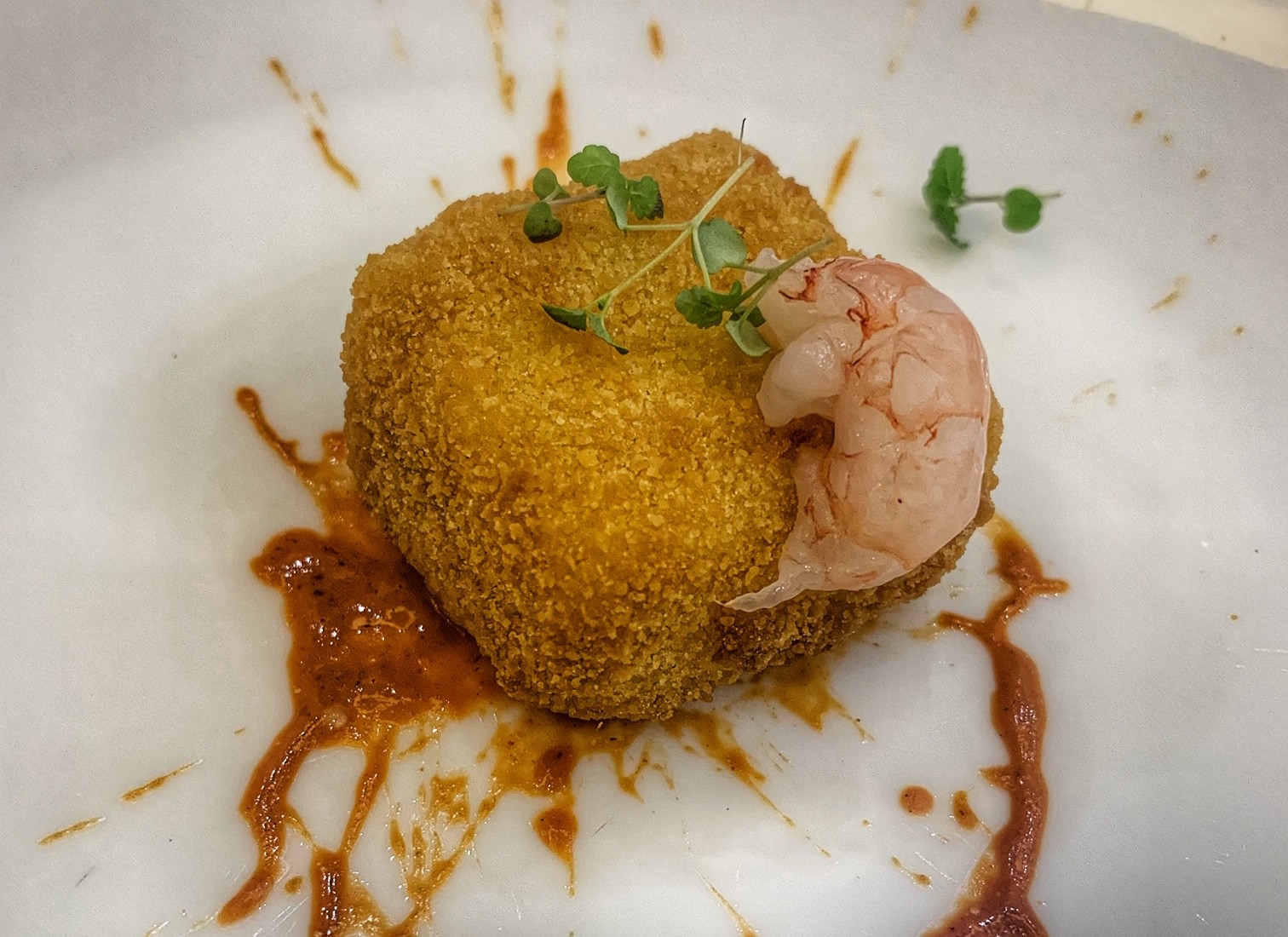 Si parte dall’entrée rappresentato da un cubo di pasta e patate fritto, tartare di gambero e maionese al corallo.