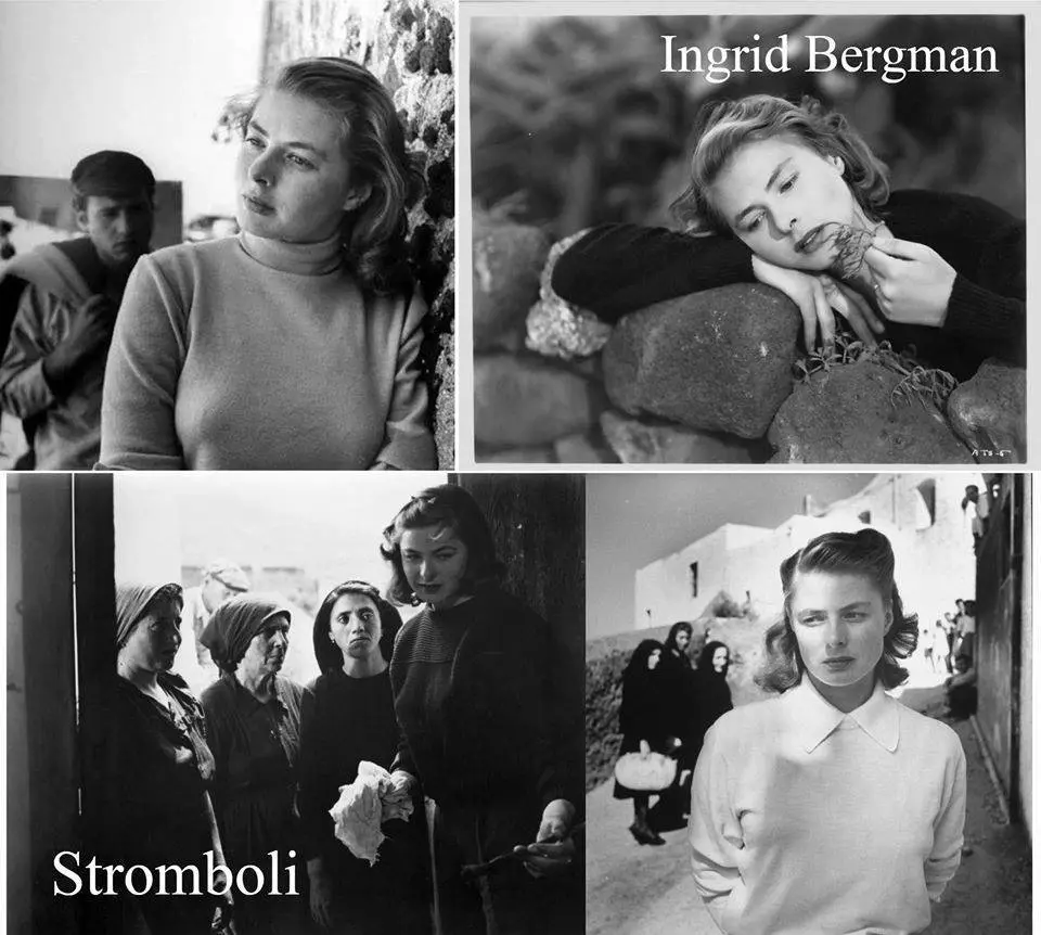 Nella primavera del 1948, quella che allora era la più famosa attrice del mondo (aveva girato “Casablanca”, “Per chi suona la campana”, “Notorious” e ricevuto quattro nomination all’Oscar) scrisse un’appassionata lettera al maestro del neorealismo italiano: “Caro Signor Rossellini – vi si leggeva – ho visto i suoi film “Roma città aperta” e “Paisà” e li ho apprezzati moltissimo. Se ha bisogno di un’attrice svedese che parla inglese molto bene, che non ha dimenticato il suo tedesco, non si fa quasi capire in francese e in italiano sa dire solo “ti amo”, sono pronta a venire in Italia per lavorare con lei”. Roberto Rossellini non esitò a scritturare l’attrice svedese per il suo nuovo grande progetto, una trilogia di film che comprendeva anche “Stromboli, Terra di Dio”, oggi considerato un classico del neorealismo italiano. Nel film la Bergmam recita il ruolo di Karin…una profuga lituana ed ex collaborazionista dei nazisti, che sposa un soldato siciliano per sfuggire al campo di prigionia. Stabilitasi a Stromboli, Karin rimane incinta ma non riesce ad adattarsi alla mentalità tradizionalista del luogo. Le incomprensioni con il marito e le frequenti eruzioni del vulcano, che mettono a rischio la vita del suo bambino, la convincono a fuggire dall’isola. Ma dopo aver rischiato di morire a causa delle esalazioni sulfuree dello Stromboli, si rassegna a rimanere sull’isola, rivolgendosi a Dio per salvare il proprio bambino. Per la sua interpretazione la Bergman vinse il Nastro d’Argento.