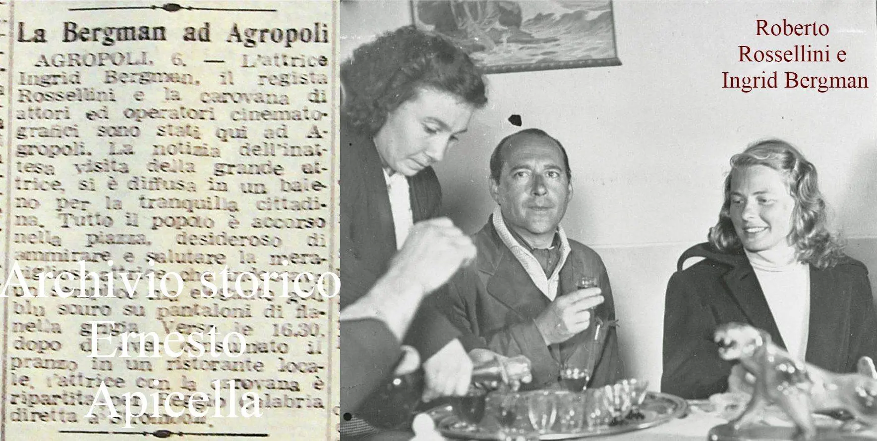 La nostra storia inizia nei primi giorni del mese di Febbraio del 1949. Dopo aver lasciato Amalfi, Roberto Rossellini e Ingrid Bergman si fermarono a Salerno. Il regista per il suo film “Stromboli, Terra di Dio”, avendo deciso di affidarsi ad attori non professionisti da affiancare alla Bergman, tenne dei provini ad alcuni pescatori, come aveva già fatto in costiera amalfitana. A Salerno scelse due pescatori: uno dei due era Mario Vitale, che divenne nel film il partner della Bergman. Lunedì 4 aprile, Rossellini e la Bergman lasciarono Salerno con al seguito gli attori e la troupe cinematografica, destinazione Reggio Calabria. La prima tappa mattutina fu a Paestum. La coppia visitò l’area Archeologica, ammirando la maestosità dei tre Templi dorici. Dopo aver scattato alcune foto ricordo, la carovana cinematografica riprese la SS18 alla volta di Agropoli. Qualcuno a Paestum aveva consigliato a Rossellini di fermarsi ad Agropoli, per visitare il borgo dei pescatori e per gustare a pranzo la famosa “zuppa di pesce” del Ristorante Carola.