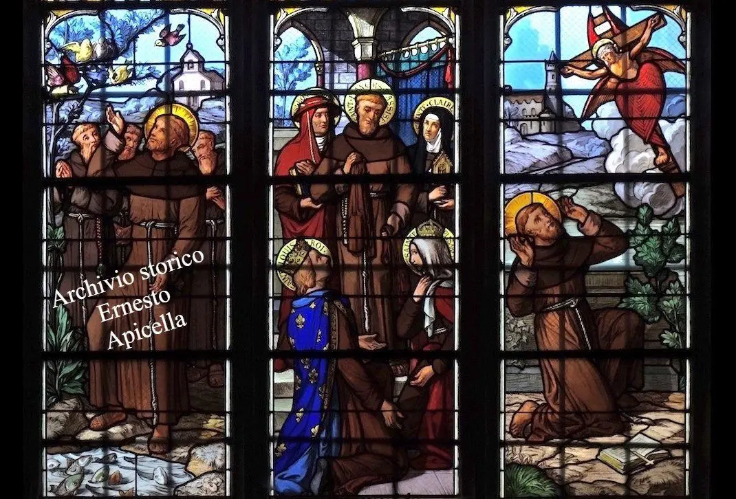 Nella navata nord della Basilica, rinnovata nel XIX secolo e restaurata nel 2006, c’è la cappella del Santo Teologo Bonaventura da Bagnoregio, dove troviamo l’altare di San Bonaventura del XIX secolo, una Pala dell’artista Xavier Bourges e le statue di San Tommaso d’Aquino e di Sant’Antonio di Padova. Inoltre, è presente una vetrata policroma ad arco ovale, realizzata nel 1870, che misura all’incirca mt. 3 di base x mt. 4 di altezza. La vetrata fu creata dalla bottega del maestro vetraio Johann Caspar Julius (1814-1904), artista e pittore del vetro che operava a Parigi. La vetrata raffigura le grandi figure francescane del XIII secolo: al centro, San Bonaventura e Santa Chiara, in ginocchio San Luigi e Santa Elisabetta d’Ungheria; a destra, la stigmatizzazione di San Francesco d’Assisi; a sinistra, San Francesco d’Assisi che parla agli uccelli e ai pesci. Filo conduttore della sua esistenza è stato l’amore per la natura. Per lui tutti gli animali meritavano rispetto e il suo “Cantico delle Creature” inizia proprio con una lode: “Laudato sie, mi’ Signore, cum tucte le tue creature.. ”. San Francesco d’Assisi, in questa scena, viene rappresentato durante una preghiera ed un sermone che rivolge agli animali, in particolare agli uccelli ed ai pesci. Ed ecco che ritorna l’iconografia del “Miracolo dei Pesci”, che San Francesco d’Assisi, come riportato da numerosi ed autorevoli testi, nonché da storiche testimonianze pittoriche, compì ad Agropoli nel 1222. Un altro passo verso l’affermazione della presenza di San Francesco d’Assisi ad Agropoli, è stato fatto. Spero, nelle prossime settimane, di proporvi altre nuove ed esclusive testimonianze.