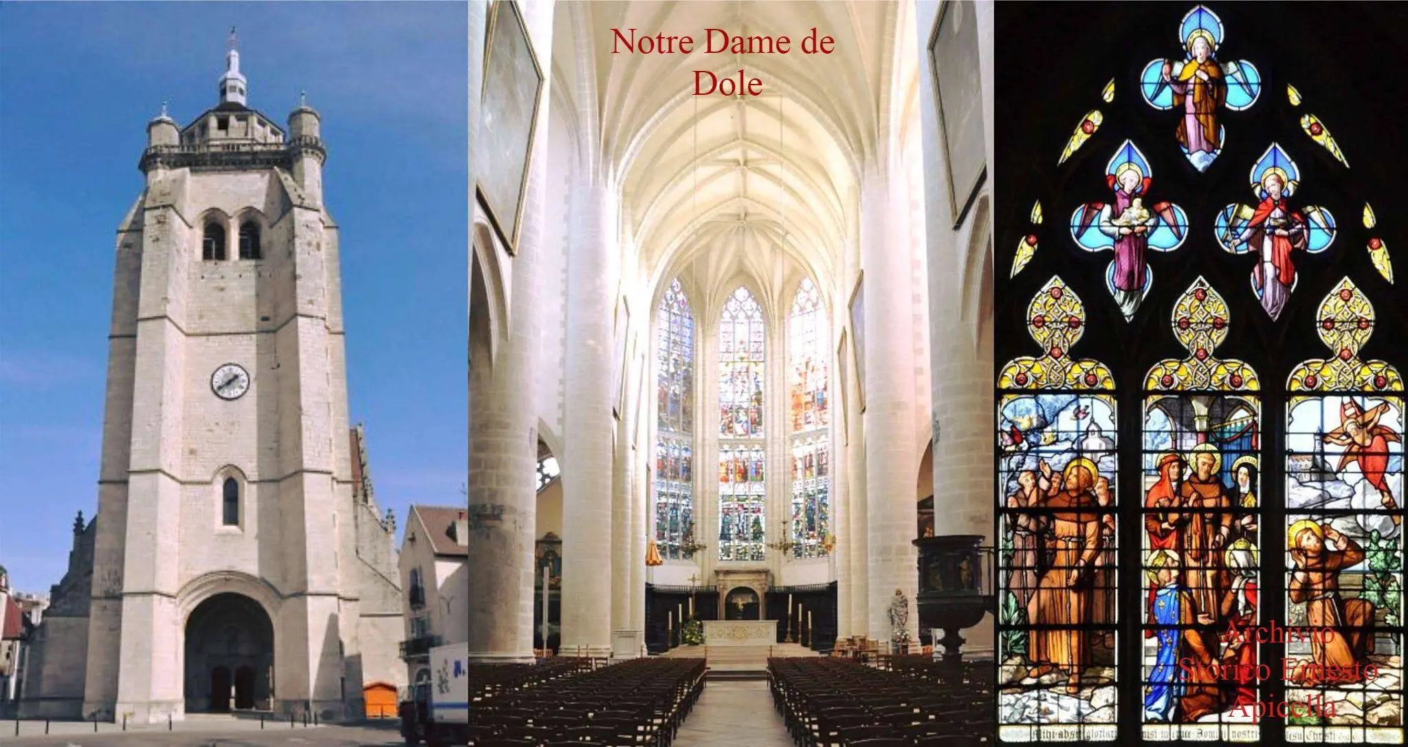 La collegiata di Notre-Dame de Dole, che divenne Basilica nel 1951, rimane, fino alle conquiste di Luigi XIV, la Cattedrale principale della Contea di Borgogna. Saccheggiata durante la Rivoluzione Francese, vedrà le sue cappelle laterali completamente restaurate e riarredate tra il 1840 ed il 1919. Oggi l’edificio contiene alcune notevoli opere d’arte: statue borgognone del XV secolo, cappelle neogotiche, dipinti di Laurent Pécheux ( XVIII secolo) e bellissime vetrate del XIX e XX secolo (Gsell, Laurent, Gruber, Le Chevallier).