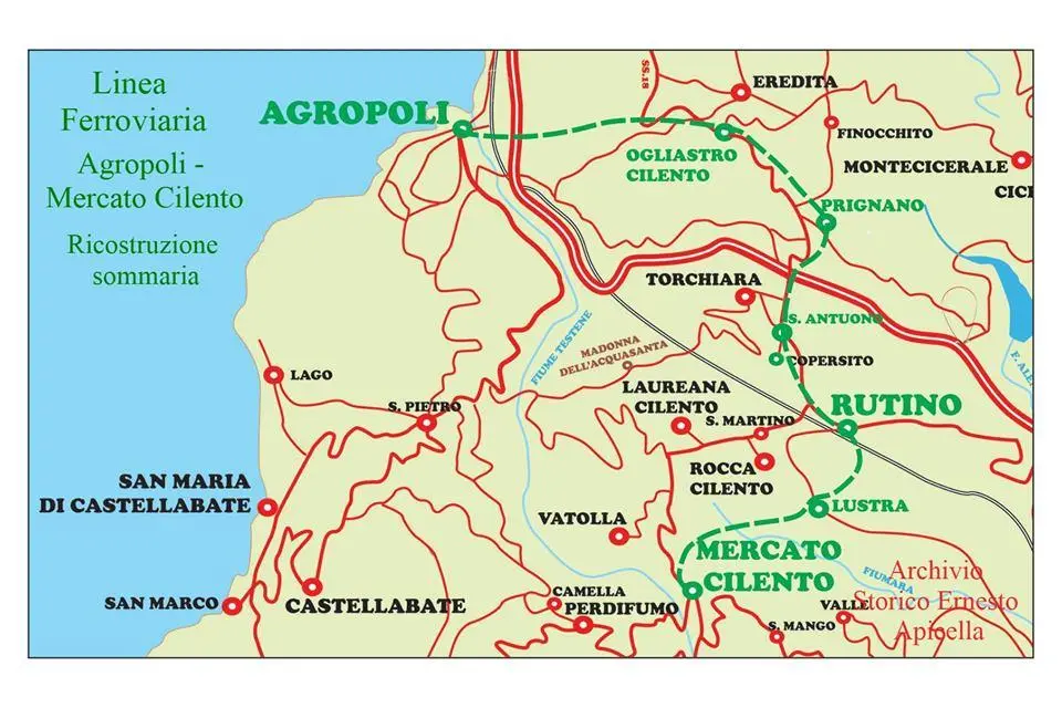 Sul settimanale āMonitore delle Strade Ferrateā del 29 novembre 1890, (Anno XXIII, n°48), fu pubblicata la richiesta presentata da una āSocietĆ Cilentanaā al Regio Ministero dei Lavori Pubblici, per la concessione della costruzione e dellāesercizio di una linea ferroviaria da Agropoli a Mercato Cilento. Il progetto tecnico ambizioso, ma anche stravagante, prevedeva tre stazioni: Agropoli, Rutino e Mercato Cilento. Con fermate ad Ogliastro, Prignano, S.Antuono, S. Maria della Tempitella, Lustra.