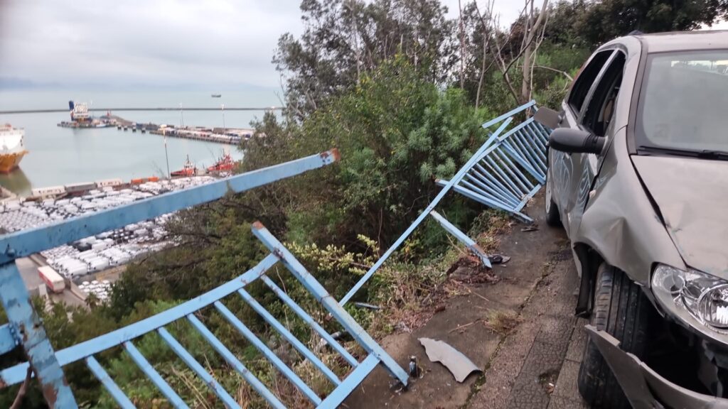 L’automobile, ha abbattuto le barriere di protezione ed ha rischiato di precipitare giù con conseguenze che sarebbero state sicuramente drammatiche per gli occupanti della vettura.