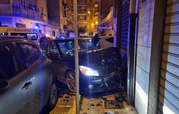 La Mercedes dopo l’impatto è finita sul marciapiede terminando la sua corsa contro la saracinesca di un’attività commerciale.