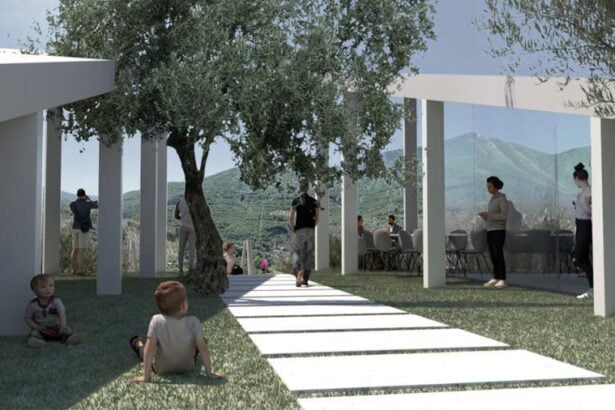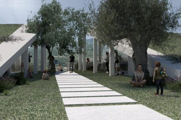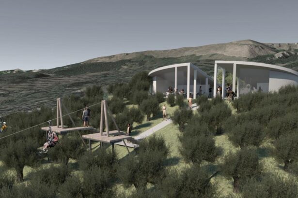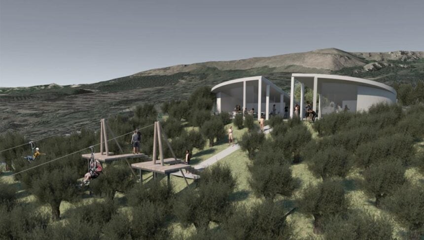La stazione di partenza della zipline, collocata proprio in cima alla collina del paese, diventerà sia uno spazio di accoglienza per i turisti che uno spazio pubblico per il tempo libero, immerso nel paesaggio all’ombra degli ulivi.
