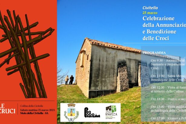 “Il prossimo sabato 25 marzo si rinnova sulla Civitella una tradizione millenaria, in cui si celebra la Annunciazione del Cristo Salvatore e il giorno della sua Assunzione al Regno dei Cieli. L’annunciazione e la Croce, simbolo di vita, vita eterna, e nuova nascita – fanno sapere dal Parco della Civitella ricordando l’iniziativa – Questo simbolo assurge nella civiltà contadina ad elemento apotropaico, protettivo e generativo, da collocare nella casa ma soprattutto nei campi e nelle vigne. Grazie alla Pro Loco Moio della Civitella per la organizzazione della giornata, con escursioni e visite guidate, ed al nostro amico Fabio Merola per la splendida grafica che ha voluto dedicare alla giornata“.