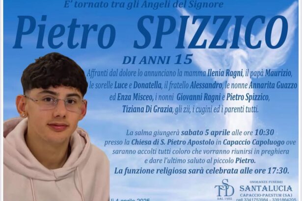 Domani, ad accogliere il giovane, la Chiesa di San Pietro Apostolo di Capaccio Capoluogo in cui la salma arriverà alle ore 10:30. La Chiesa, in cui in questi giorni centinaia di persone si sono riunite per pregare per Pietro, rimarrà aperta per quanti vorranno dare l’ultimo saluto ad un ragazzo sportivo, solare e generoso, venuto a mancare troppo presto.