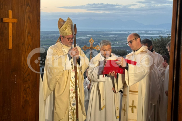 Proprio dall’ingresso del Santuario, con un meraviglioso panorama alle spalle, il Vescovo Calvosa, affiancato dai sacerdoti, ha aperto la cerimonia.