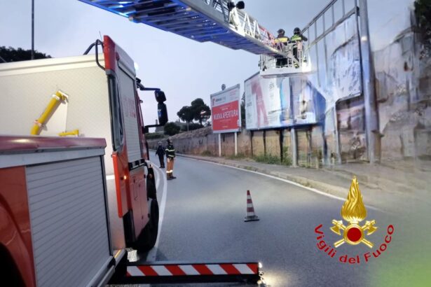 L’allarme è stato lanciato dalla Polizia Municipale, che ha prontamente chiesto l’ausilio sul posto della squadra dei vigili del fuoco della sede centrale e un’autoscala. I caschi rossi, con abilità e tempestività, sono intervenuti per rimuovere il materiale pubblicitario pericolante e mettere in sicurezza l’area.