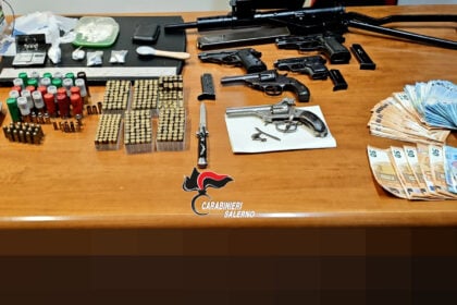 Secondo la ricostruzione della Polizia Giudiziaria operante, l’uomo è stato fermato alla guida di un’autovettura e sottoposto a perquisizione personale, veicolare e domiciliare, rinvenendo nella sua disponibilità sostanza stupefacente del tipo cocaina, per un perso di circa 50 grammi, un coltello a scatto, un fucile, tre pistole di cui due a salve modificate e pronte all’uso, due rivoltelle e munizionamento vario, nonché 5.000,00 euro in contanti.