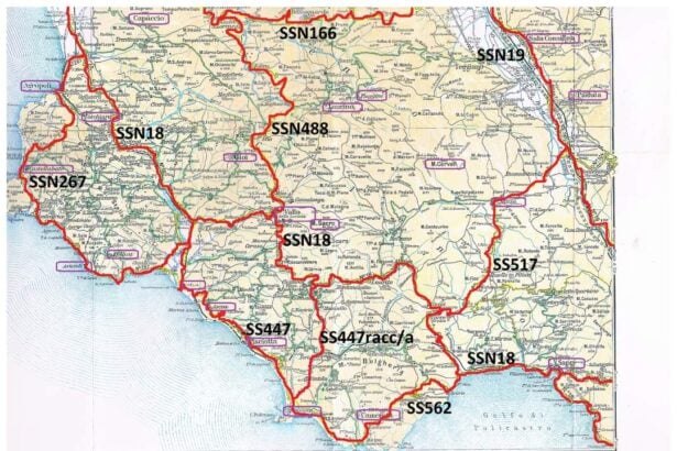 Fa discutere la mappa dello stradario Cilentano pubblicata da AsitCilento (Associazione pro Cilento in tutti i settori). All’attenzione, evidenziate in rosso, le maggiori arterie di collegamento tra la costa e l’interno, che secondo Asit, sarebbero state completamente abbandonate. Fra le molte che richiederebbero interventi strutturali, manutenzione e messa in sicurezza, la SS267 – SS447 e relativo raccordo, la SS488 e la SS562.