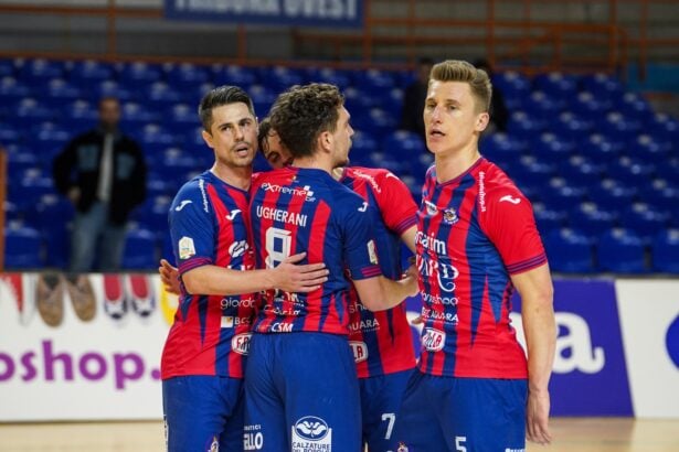 Sconfitta invece per lo Sporting Sala Consilina che cede a Catania per 5-2 contro i campioni d’Italia uscenti della Meta. I ragazzi di coach Cipolla passano addirittura in vantaggio al 4′ con Vidal, autore di una rete al volo di pregevolissima fattura, su una palla che arrivava dal settore opposto. I campioni d’Italia pareggiano i giochi però al 6′ con Pulvirenti per trovare al 12′ il sorpasso con Podda per il 2-1 di metà gara. Nella seconda frazione al 10′ Miotto porta la contesa sul momentaneo 3-1 mentre al 12′ Edelstein riapre la sfida siglando, da pochi passi, il 3-2 dopo una respinta corta del portiere siculo. Lo stesso calcettista al quarto d’ora fallisce il rigore che poteva rimettere in totale equilibrio la gara. Nel finale, invece, Bocao al 16′ e Miotto, a pochi secondi dal gong finale chiudono definitivamente la sfida sul 5-2.