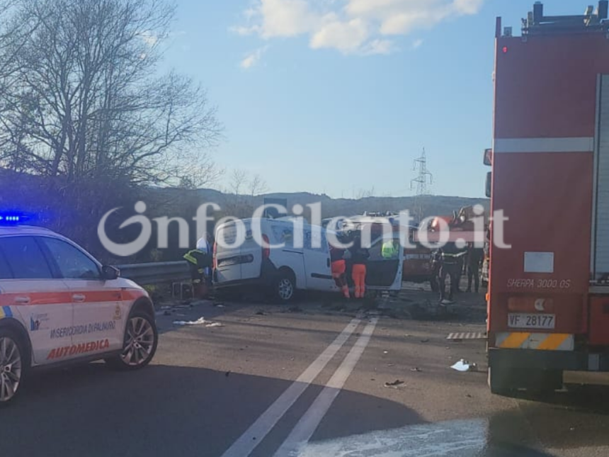L’auto, dopo l’impatto, ha terminato la sua corsa contro il guard rail. Sul posto immediato l’intervento dei sanitari del 118 e dei vigili del fuoco del distaccamento di Policastro Bussentino. Questi ultimi hanno provveduto ad estrarre l’uomo alla guida del Doblò (originario di Camerota) dalle lamiere prima di affidarlo alle cure dei sanitari della Misericordia e della New Geo che lo hanno trasportato in ospedale a Salerno facendo la spola con un’eliambulanza.