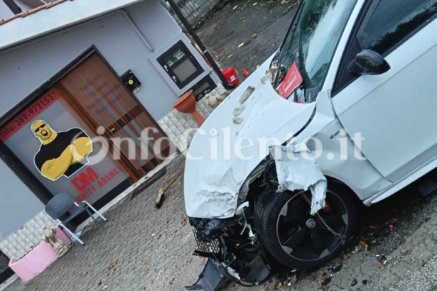 Questa mattina si è verificato un violento incidente ad Atena Lucana Scalo. Un’automobile, per motivi ancora da chiarire, ha colpito con forza un muretto ai lati della carreggiata, causando la frantumazione di una parte di esso in cemento armato e spaventando le persone nelle attività commerciali vicine.
