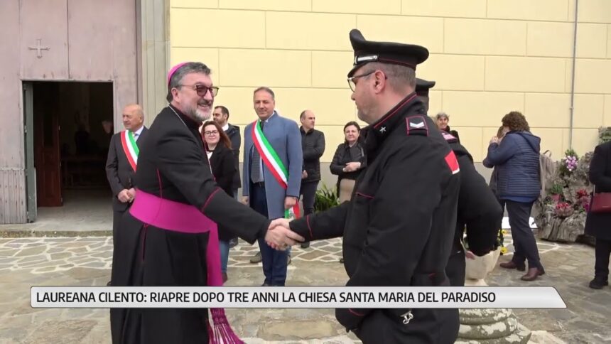 A circa tre anni dall’inizio dei lavori di restauro, ha riaperto al culto la Chiesa di Santa Maria del Paradiso, nel cuore di Laureana Cilento. Ieri la cerimonia, presieduta dal parroco, Monsignor Giovanni Di Napoli, alla presenza di tanti fedeli, dei componenti delle confraternite di Laureana e Matonti, dei sindaci di Laureana Cilento, Angelo Serra, e Prignano Cilento, Michele Chirico e dei rappresentanti delle forze dell’ordine.