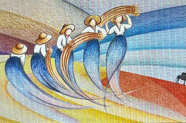 Ricevendo l’incarico di creare un’immagine rappresentativa dell’identità di Sapri ho ceduto infine al fascino eterno della poesia patriottica di Mercantini, che adotta il punto di vista innocente di una lavoratrice dei campi per raccontare l’impresa di Pisacane e dei suoi Trecento. – racconta l’artista Valenti – Nell’opera, di sapore futurista, ho voluto rappresentare la sequenza di attimi in cui la spigolatrice, curva sul lavoro nei campi, distoglie lo sguardo dalle fatiche del raccolto per volgerlo improvvisamente verso il mare, come per un richiamo intimo e inevitabile che cambierà il suo destino.