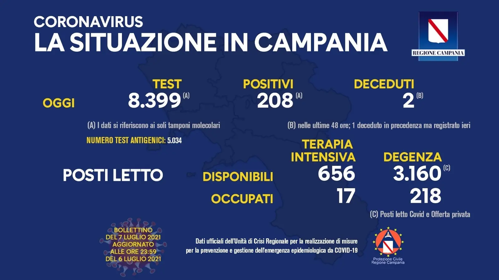 208 positivi su 8399 tamponi. Contenuto il numero di deceduti, anche il…