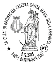 In occasione della manifestazione “La citta’ di Battipaglia celebra Santa Maria della Speranza”, a Battipaglia, lunedì 8 dicembre, Poste Italiane attiverà un servizio filatelico temporaneo, con un bollo speciale con la dicitura: “La citta’ di Battipaglia celebra Santa Maria della Speranza – 8.12.2025 – 84091 Battipaglia”, richiesto dal Comune di Battipaglia.
