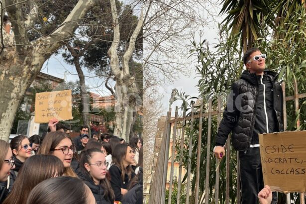 Una serie di cartelli “di cartone” sistemati in bella mostra al cancello d’ingresso della scuola, su viale Perito, il viale alberato che conduce alla stazione ferroviaria di Eboli. Cori e proteste. Aule deserte e tutti compatti.