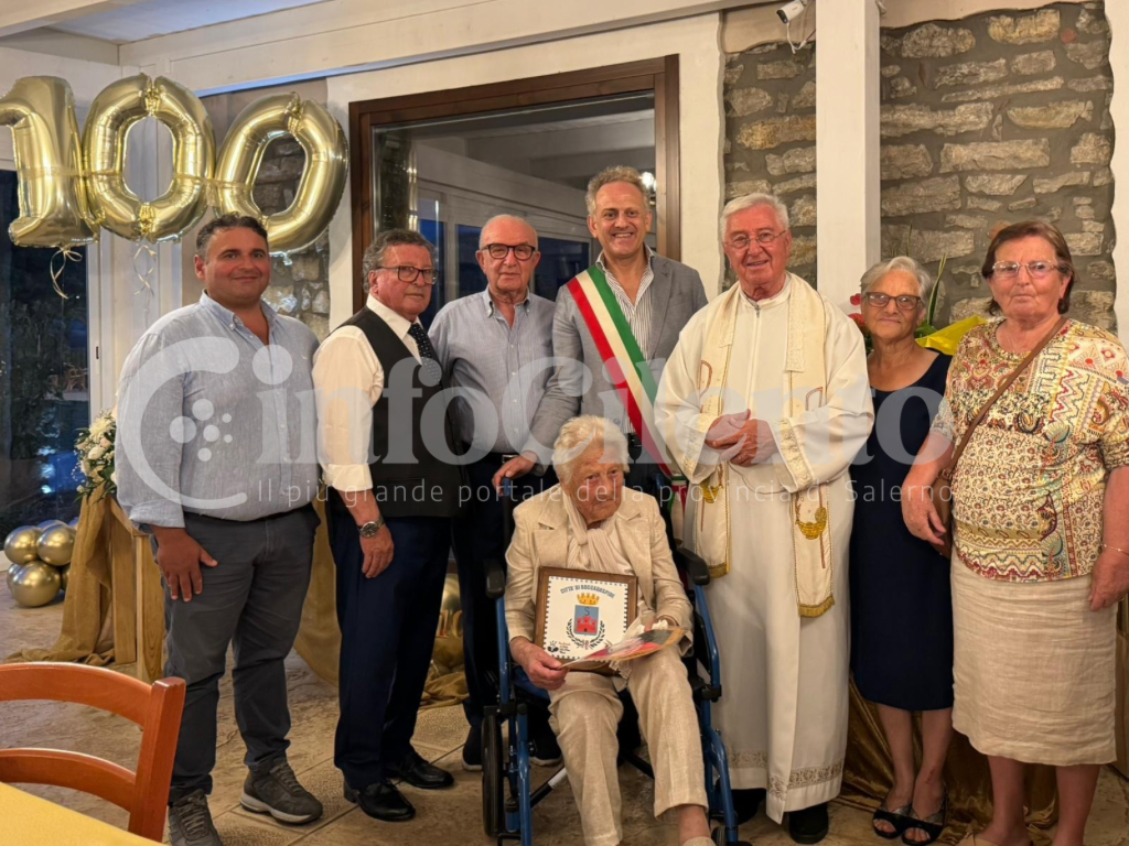 Per l’importante traguardo nonna Emmanuela è stata raggiunta da tutti i suoi cari e dall’amministrazione comunale di Roccadaspide con il sindaco, Gabriele Iuliano che le ha letto una lunga e affettuosa lettera. Gli amministratori le hanno anche fatto dono del quadro e del gagliardetto riportanti lo stemma della Città.
