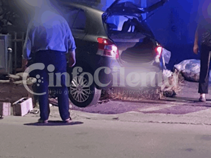 Presenti anche i Vigili del Fuoco del Distaccamento di Sala Consilina. Nell’impatto, il veicolo ha divelto una colonnina privata per la ricarica di auto elettriche.