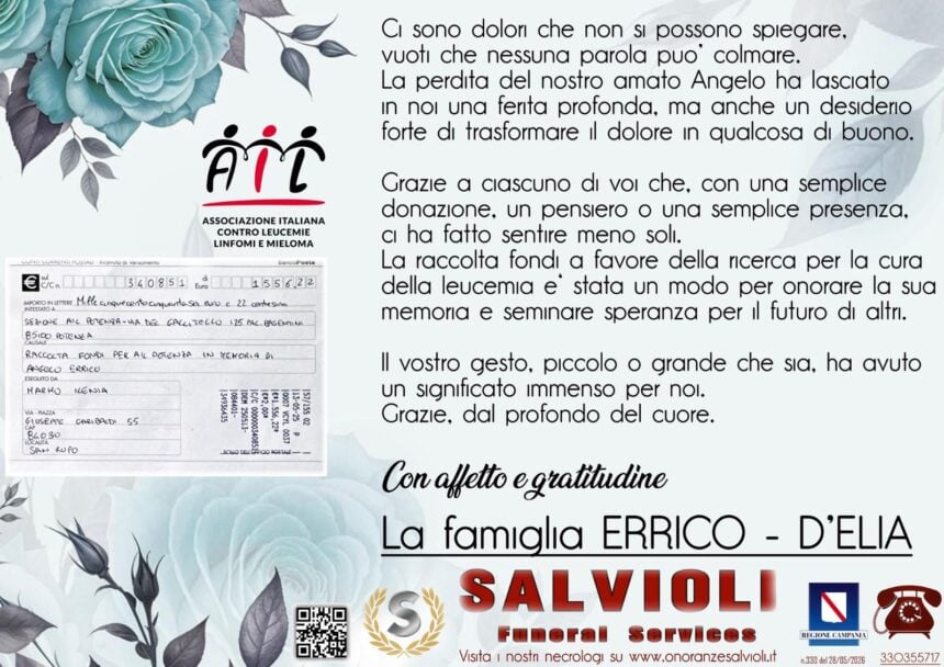 L’iniziativa ha permesso di raccogliere una somma di circa 1.550 euro, interamente devoluta alla ricerca scientifica e alla cura delle malattie ematologiche. «Ci sono dolori che non si possono spiegare, vuoti che nessuna parola può colmare. – scrive la famiglia in un toccante manifesto di ringraziamento – La perdita del nostro amato Angelo ha lasciato in noi una ferita profonda, ma anche un desiderio forte di trasformare il dolore in qualcosa di buono»