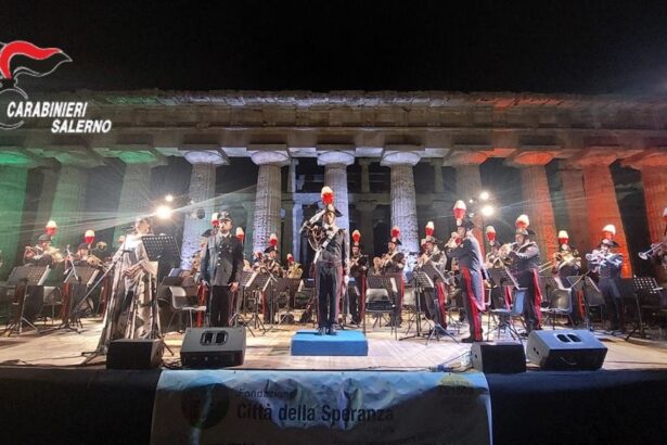 Nella serata di sabato 5 agosto, a Paestum, presso il Parco Archeologico di Paestum e Velia, nell’ambito delle iniziative a sostegno della ricerca oncologica pediatrica, si è tenuto il consueto concerto della Fanfara del 10° Reggimento Carabinieri “Campania” di Napoli, diretta dal Maestro Luca Berardo. L’Arma dei Carabinieri, infatti, è sempre pronta nel dare il proprio contributo a favore di iniziative sociali a tutela dei più deboli e di quanti operano nell’esclusivo interesse pubblico. All’evento, sostenuto dal Generale di Corpo d’Armata dei Carabinieri, in congedo,Carmine Adinolfi, impegnato da anni nel volontariato a favore della Fondazione onlus Città della Speranza, hanno presenziato il Comandante Provinciale dei Carabinieri di Salerno, Col. Filippo Melchiorre, il Comandante della Compagnia Carabinieri di Agropoli, Cap. Giuseppe Colella, ed il Comandante della Stazione Carabinieri di Agropoli, Lgt C. S. Carmine Antonio Perillo.