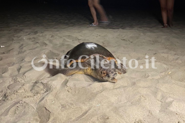 È risalita sulla spiaggia di Lentiscelle, a Marina di Camerota, probabilmente in cerca di un luogo dove deporre le sue uova, il suo bene più prezioso, ma è stata “costretta” a tornare in acqua, disturbata dai flash delle tante persone in spiaggia.