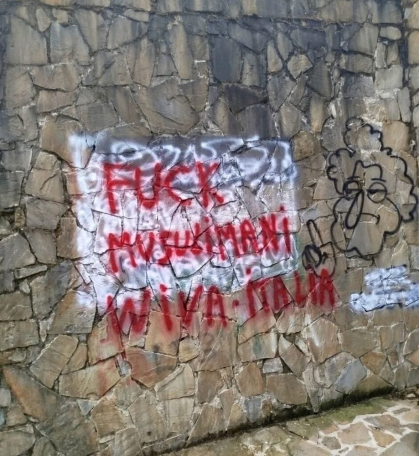 “Fuck Musulimani, wiva Italia”: è questa la scritta comparsa in questi giorni sul muro della storica Fontana dell’Inverno, nel cuore di Teggiano.